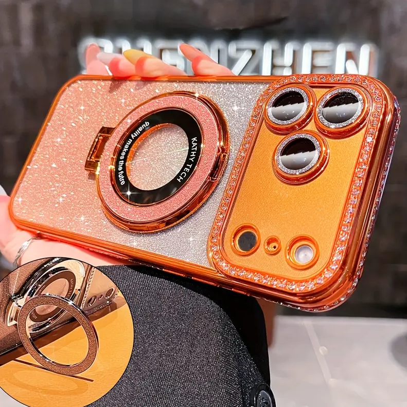 Luxury Bling Glitter Camera Rhinestone Ring Holder Gradient Sequins Plating Phone Case for iPhone